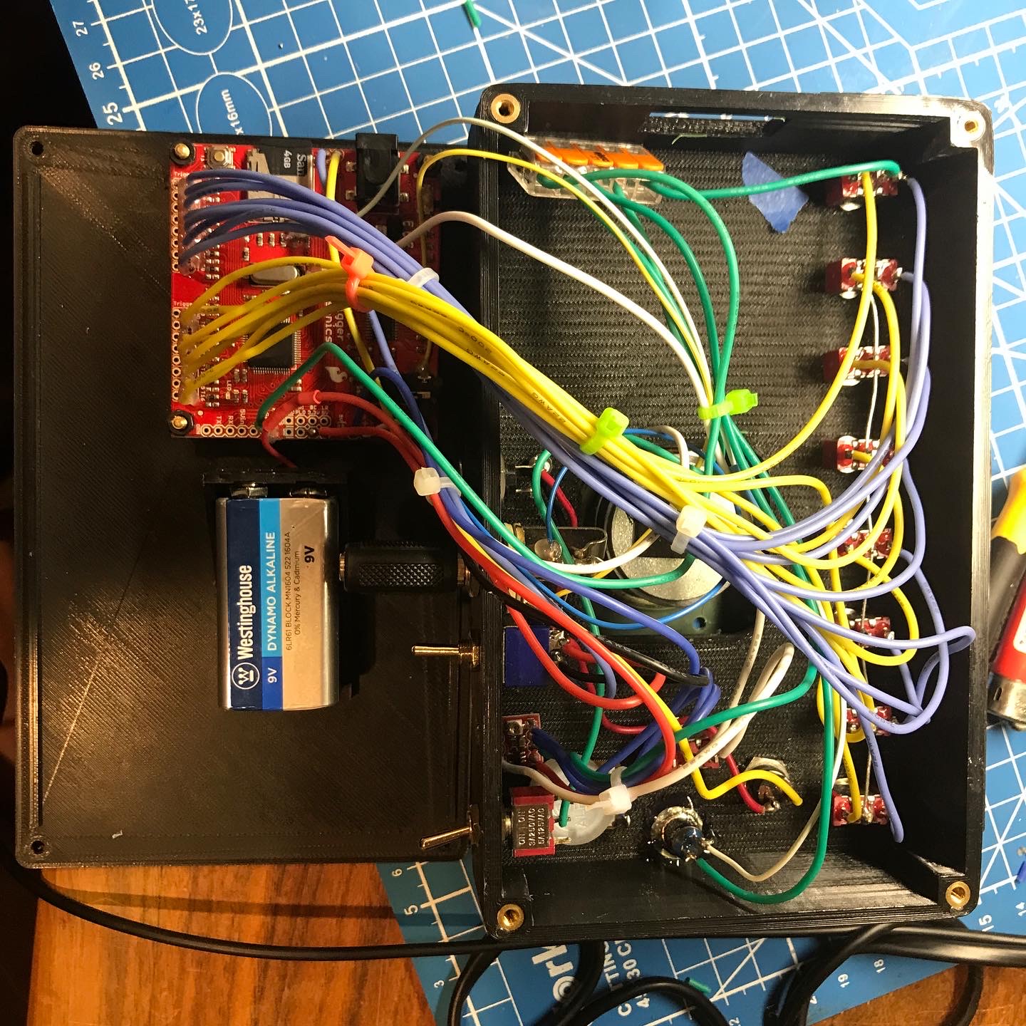 Circuit-bent is somewhat of a lie here - as detailed by LookMumNoComputer, these cheap electronic Bible players are nearly unbendable. Instead, there is a circuit-bent Sparkfun .wav player, hooked up to a series of momentary SPDT toggle switches that each trigger a different bible verse on an SD card, up to 4 of which can be played simultaneously. Glitch and pitch controls are included, with a 1/4" output jack and 9V jack (battery power optional). The bible verses can be switched out with any .wav file, making it a cute and glitchy audio trigger device. Pardon the wiring job!