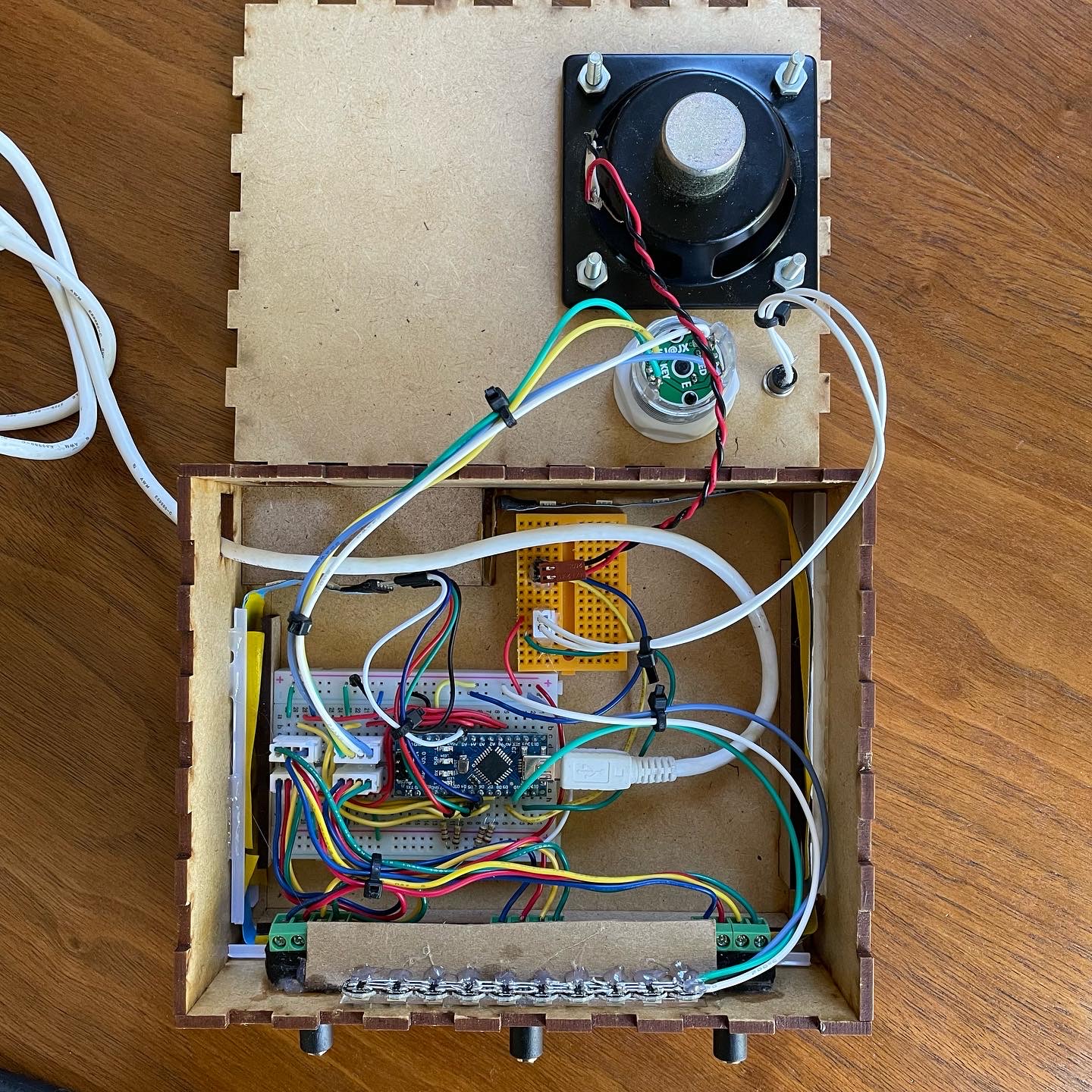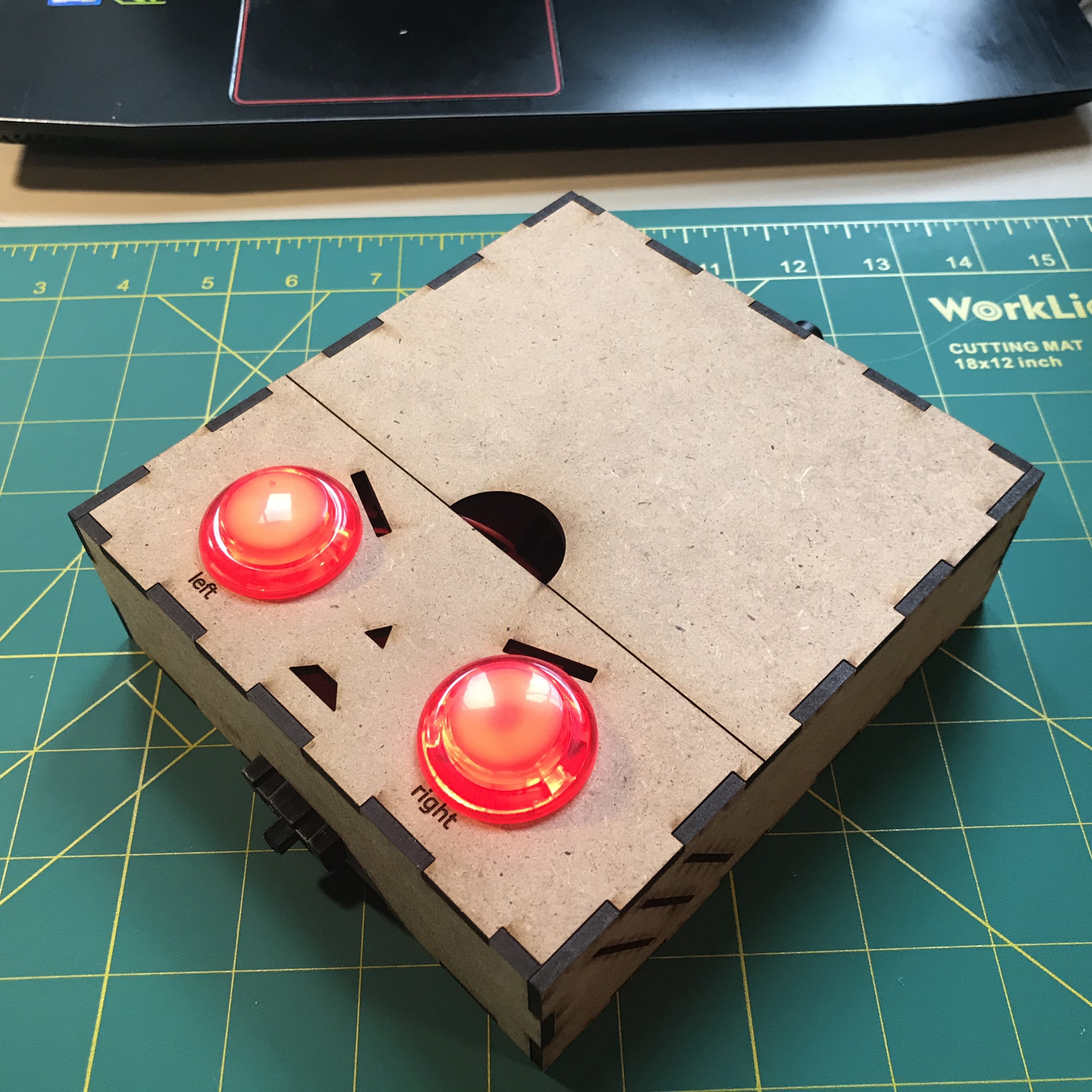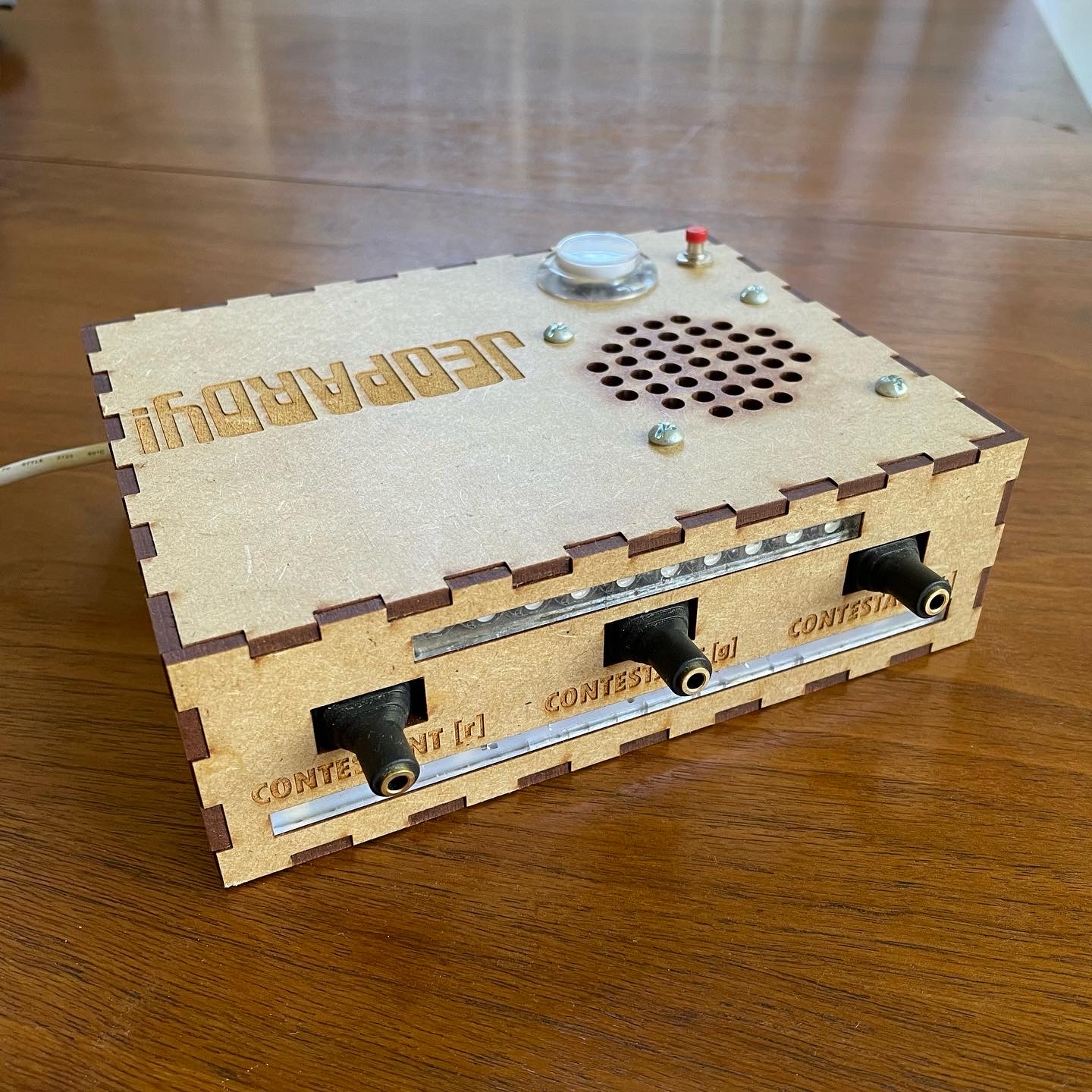 A COVID project made only with parts available at the makerspace, the box is programmed with traditional Jeopardy rules and features host controls, 3 color-coded player buzzers linked via TRRS audio cables, a speaker with unique sounds for all actions, and two seperate LED circuits. Electronics are housed in a laser cut enclosure and powered by a cheap Arduino Nano clone. I'm particularly proud of the 10-unit Neopixel array used as a countdown indication, which act just like the real contestant podiums!