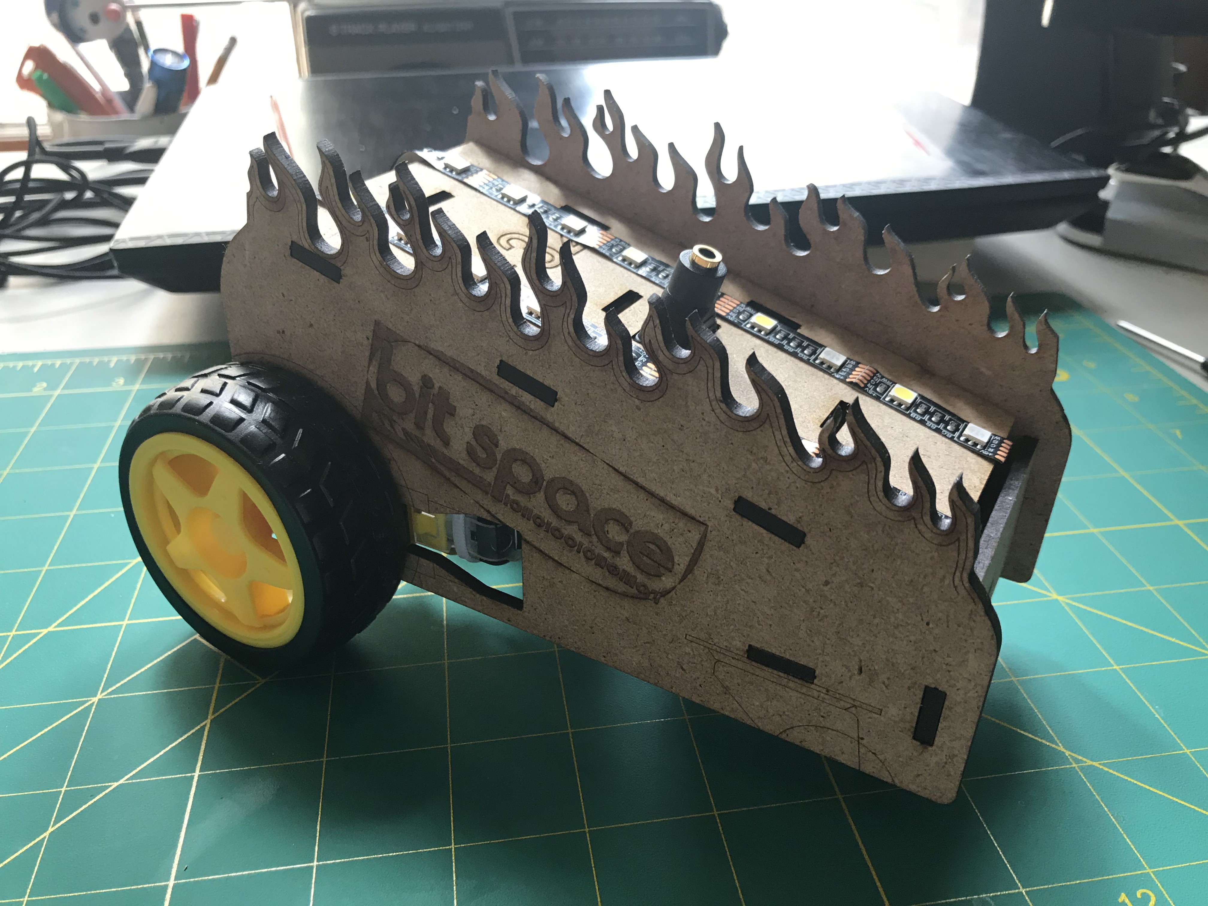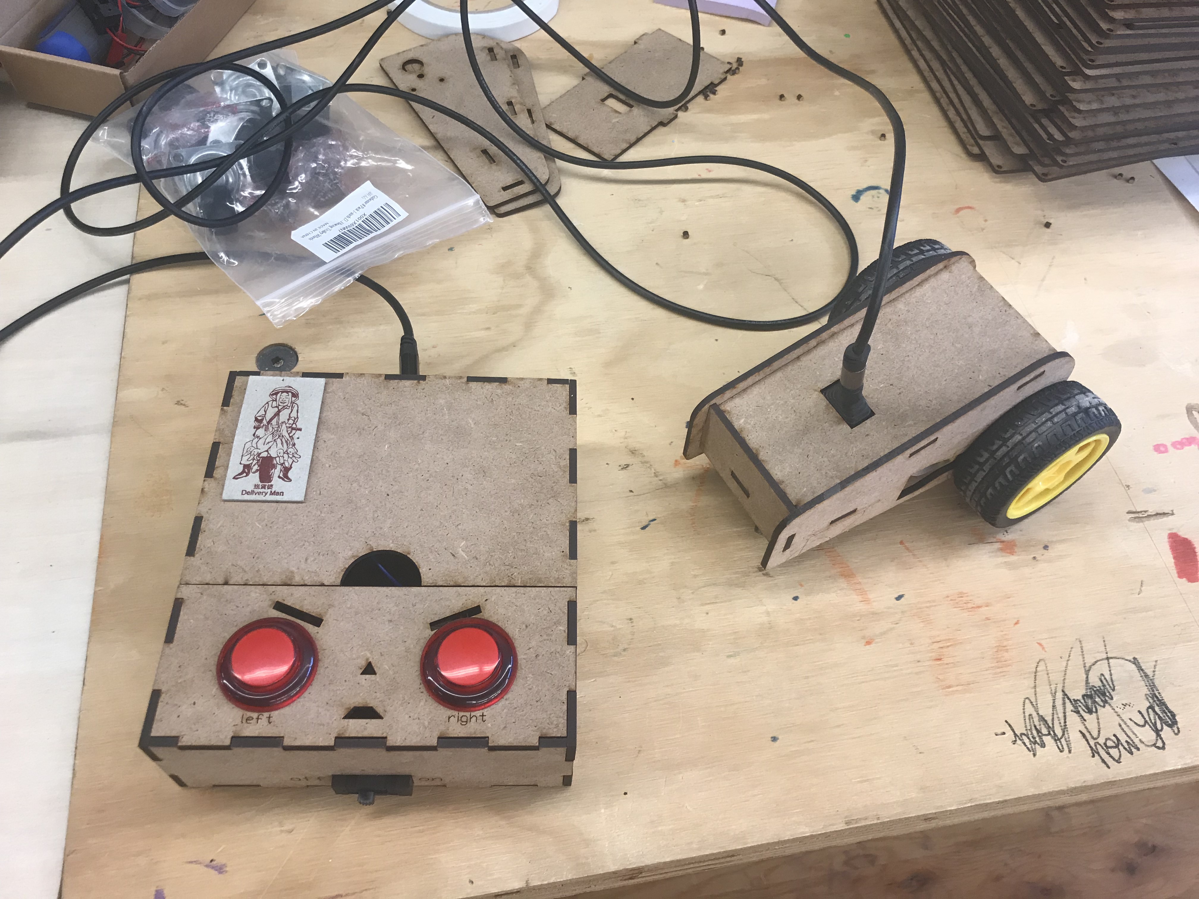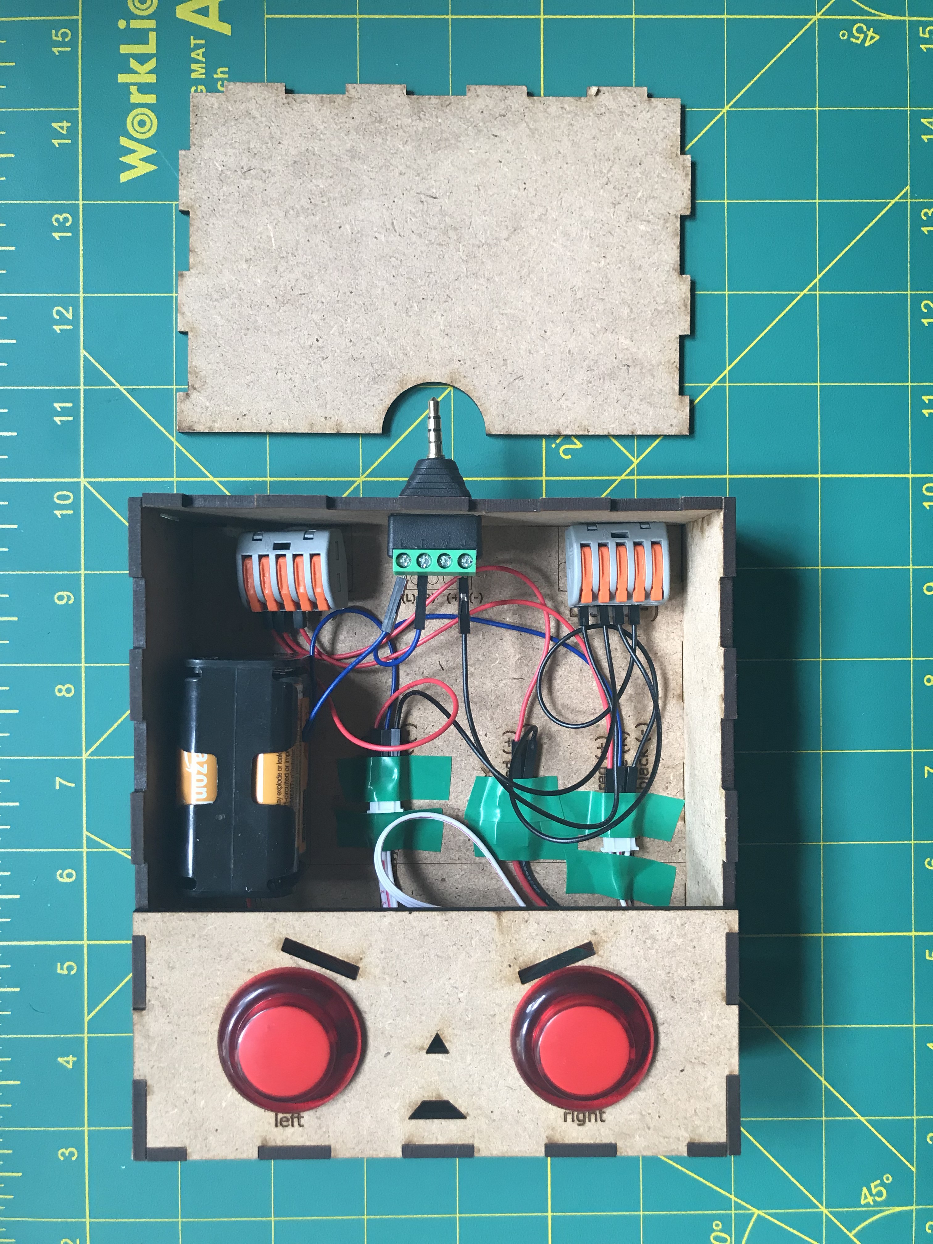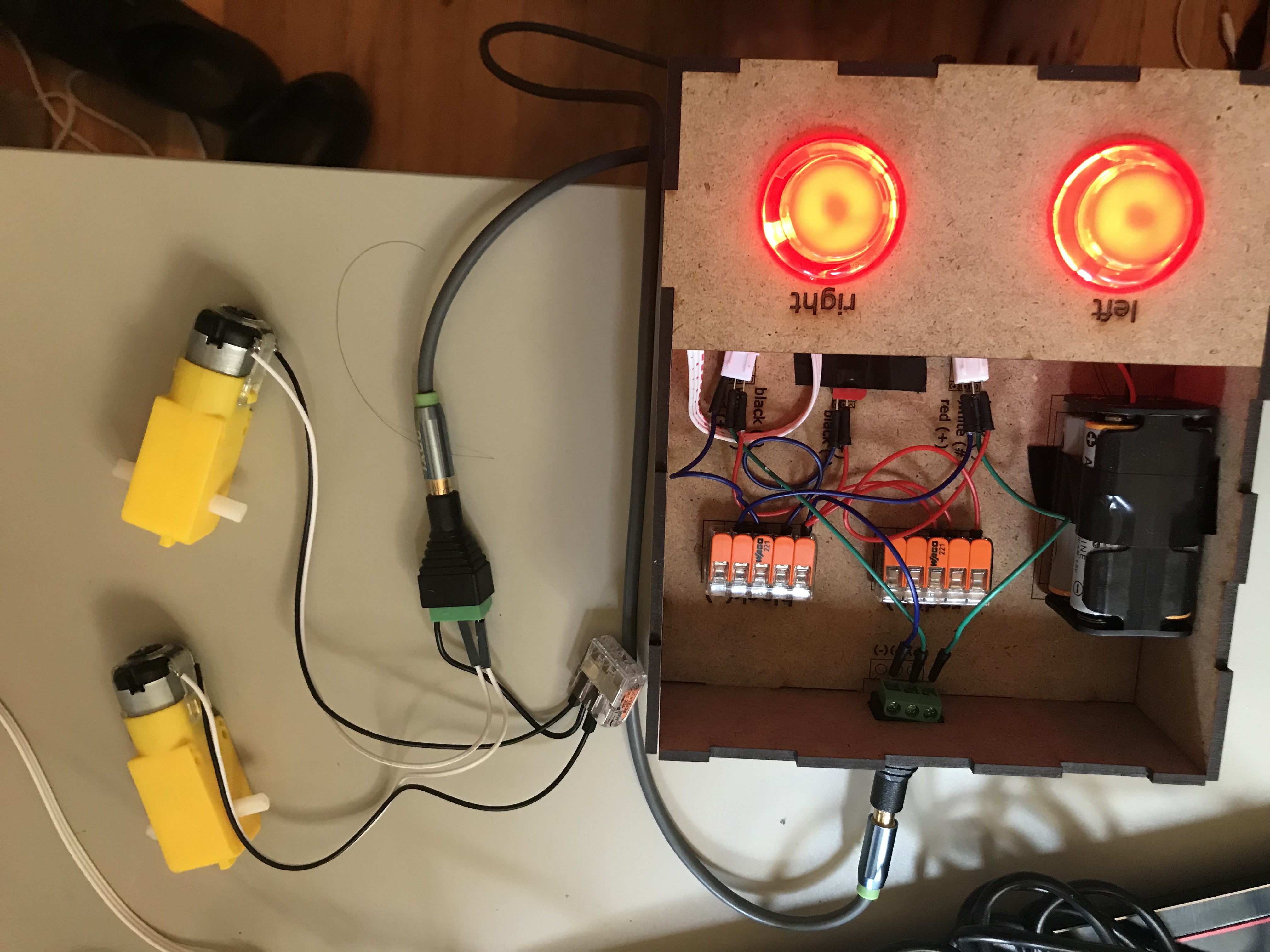 Designed while I was a Product Engineer // Makerspace guide at BitSpace Chicago. Arcade buttons respectively control left and right DC hobby motor - signal travels with a TRRS audio cable that tethers the controller to the car. Assembly slides linked here.