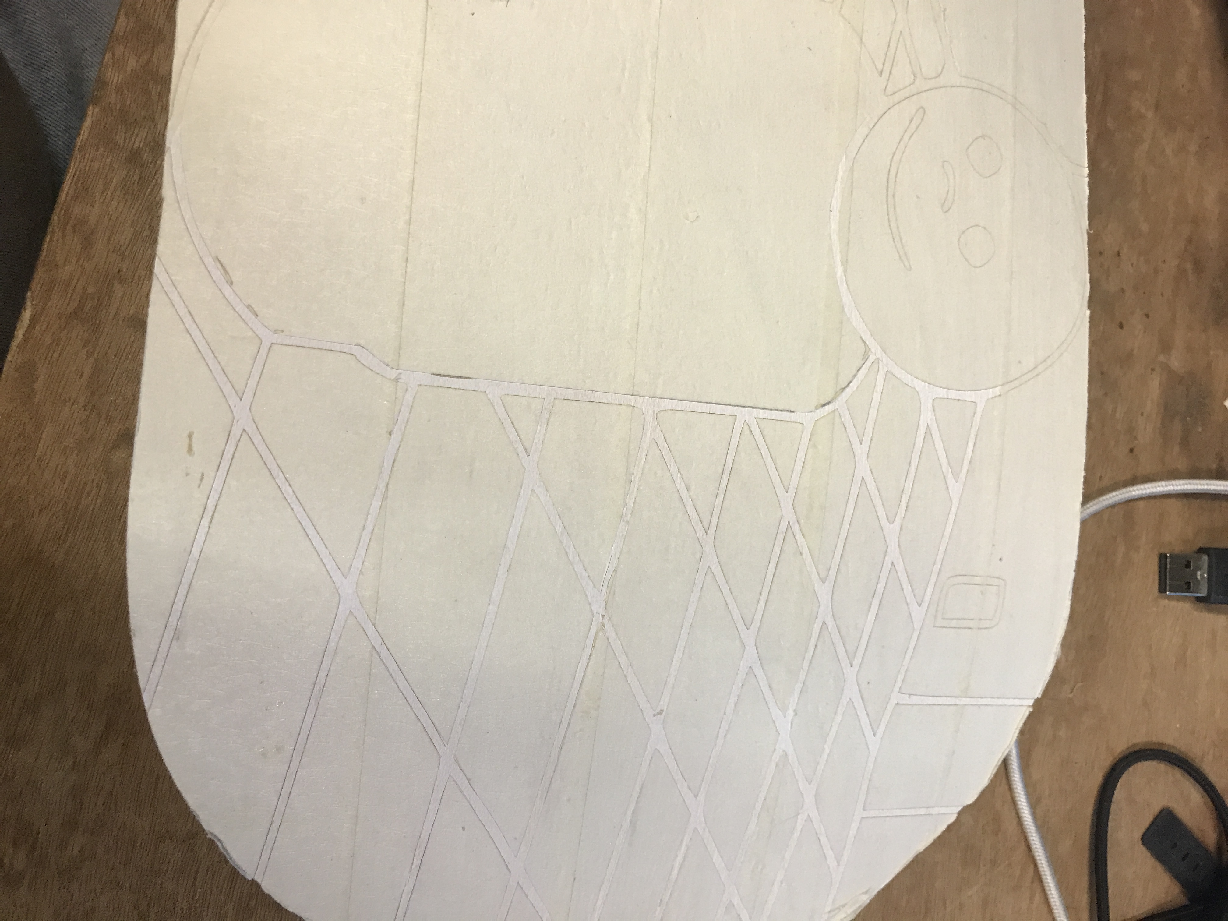 7 layers of maple veneer glued in perpendicular orientation, placed in a vacuum bag, and shaped around a carved foam mold. Once the glue is dry, the shape is jigsawed out, painted, and finished. I'll be the first to admit I'm no painter, so I used a laser cutter to etch out a layer of masking tape.